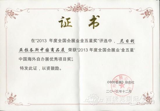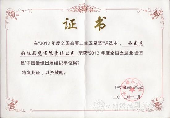 洽谈会期间还举办了“2013年度全国会展业金五星颁奖典礼”,表彰中国展览行业内的优秀组织机构与个人。我公司作为中国出展行业龙头企业,先后获得“中国最佳出展组织单位奖”、“中国海外自办展优秀项目奖”等三个奖项。公司展览九部部门经理纪效伟出席洽谈会并代表公司领取相关奖项。