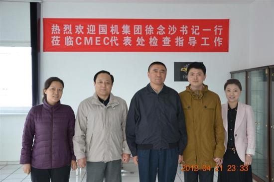 图为张力总经理(左一)陪同徐念沙书记(左三)、张建国副总裁(左二)在CMEC代表处视察工作的合影