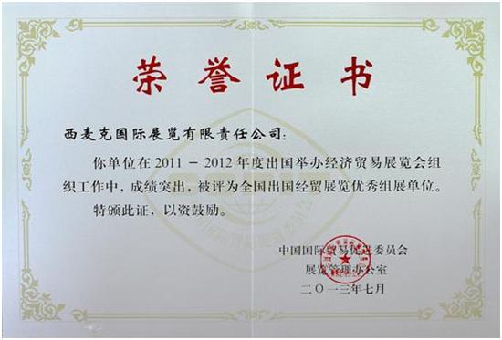 西麦克展览公司在2011-2012年度出国办展组织工作中取得骄人成绩,受到贸促会展览管理办公室的通报表扬,被评为“全国出国经贸展览优秀组展单位”。