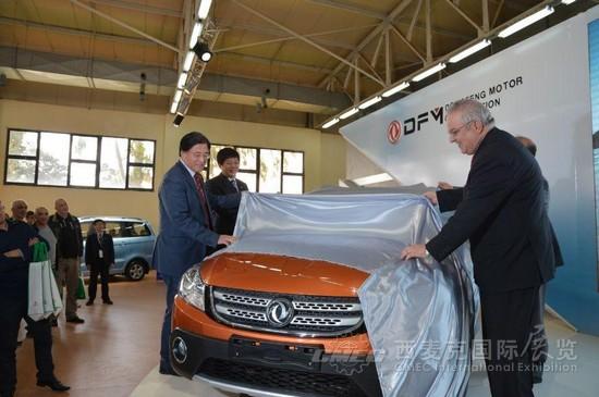 图为阿尔及利亚总统特别顾问马来科.塞拉先生、中国驻阿尔及利亚大使馆大使刘玉和、东风汽车公司海外事业部总经理潘成政先生共同为东风风神H30 CROSS揭幕)