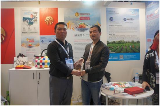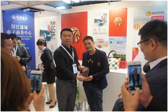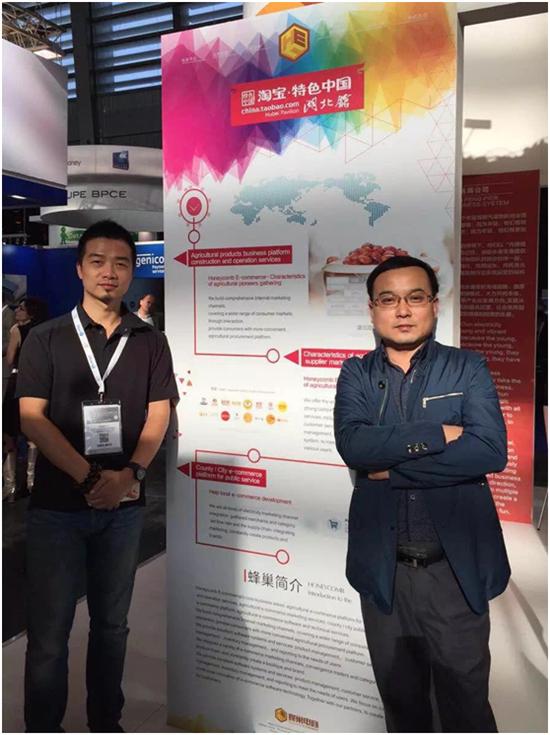 图为荆门市商务局杨科长(右)和湖北蜂巢电子商务总经理兼湖北省电商协会副会长李总在展位上合影(左)