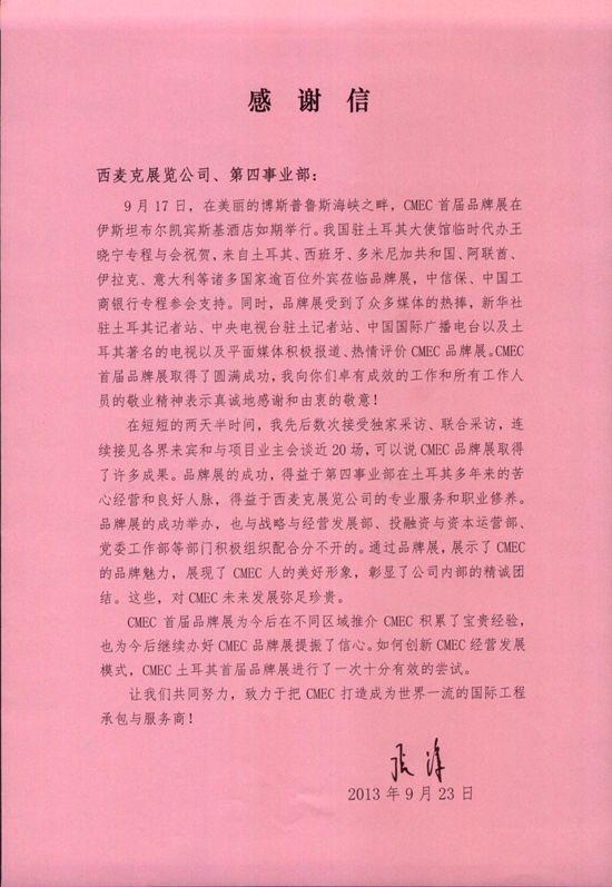 CMEC土耳其品牌展的感谢信